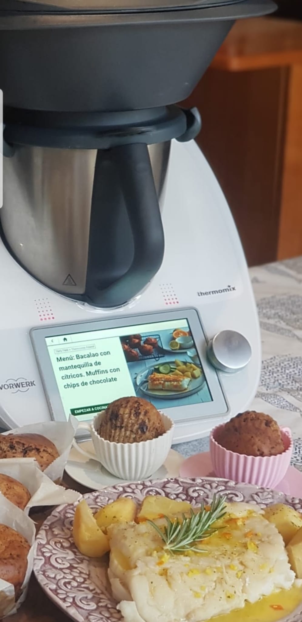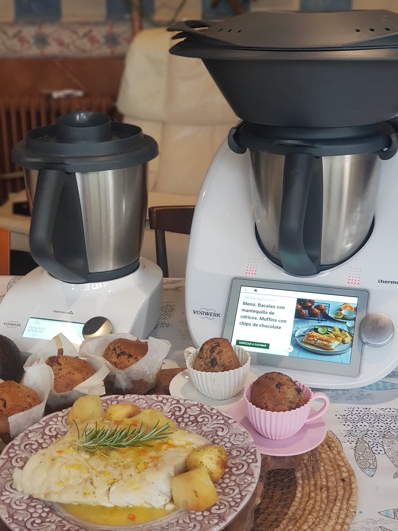 Hoy prepare con ambos un menú muy rico: Bacalao con mantequilla de cítricos. Muffins con chips de chocolate. Aquí te cuento como lo hice, entra mira la receta y descubre el Thermomix® Friend el nuevo aliado que nos hará ganar tiempo, mientras Thermomix® Tm6 cocina, Thermomix® friend nos ayudara a continuar las recetas para adelantar trabajo, es decir podemos cocinar en paralelo.