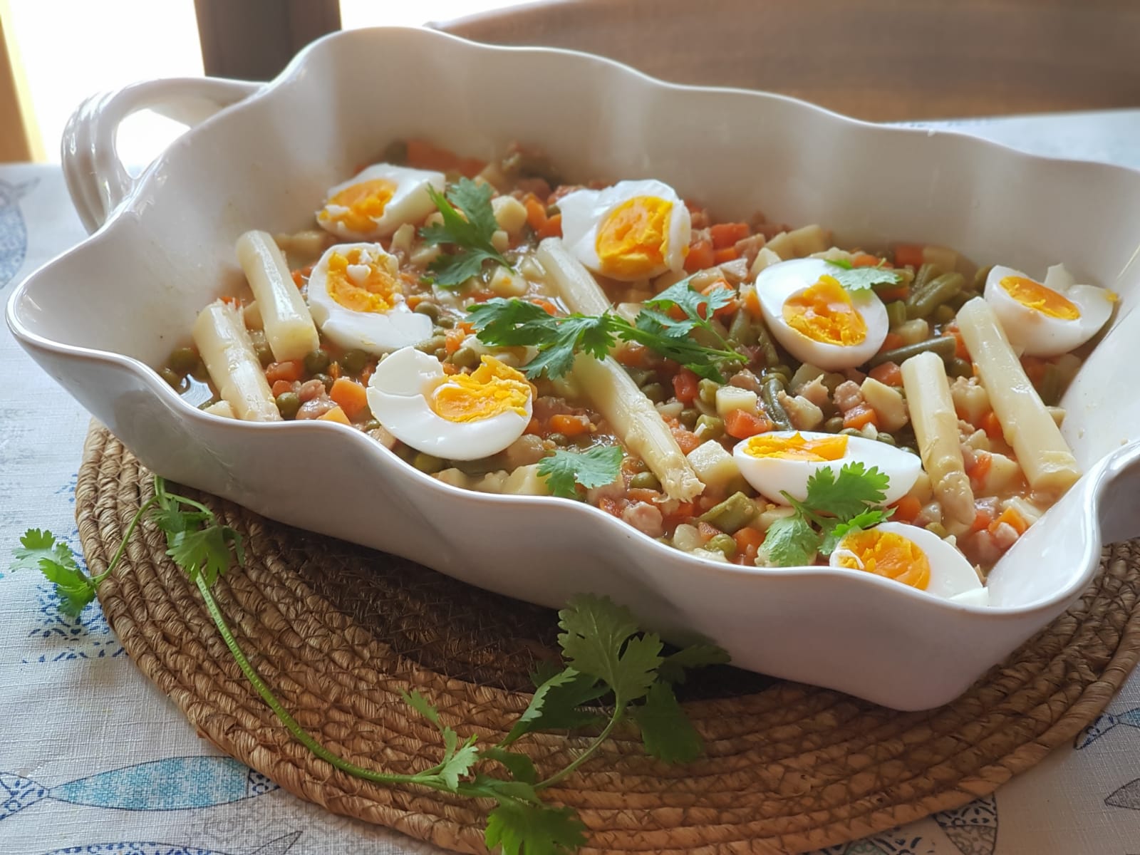 - Añada 500 g del líquido de cocción reservado y programe 2 min/100°C/vel 2. Mientras tanto, coloque las verduras del Varoma y las judías en una fuente honda, vierta por encima el contenido del vaso. Mezcle con la espátula y reparta por encima las yemas de espárragos y los huevos duros cortados en rodajas. Servir a tu gusto.