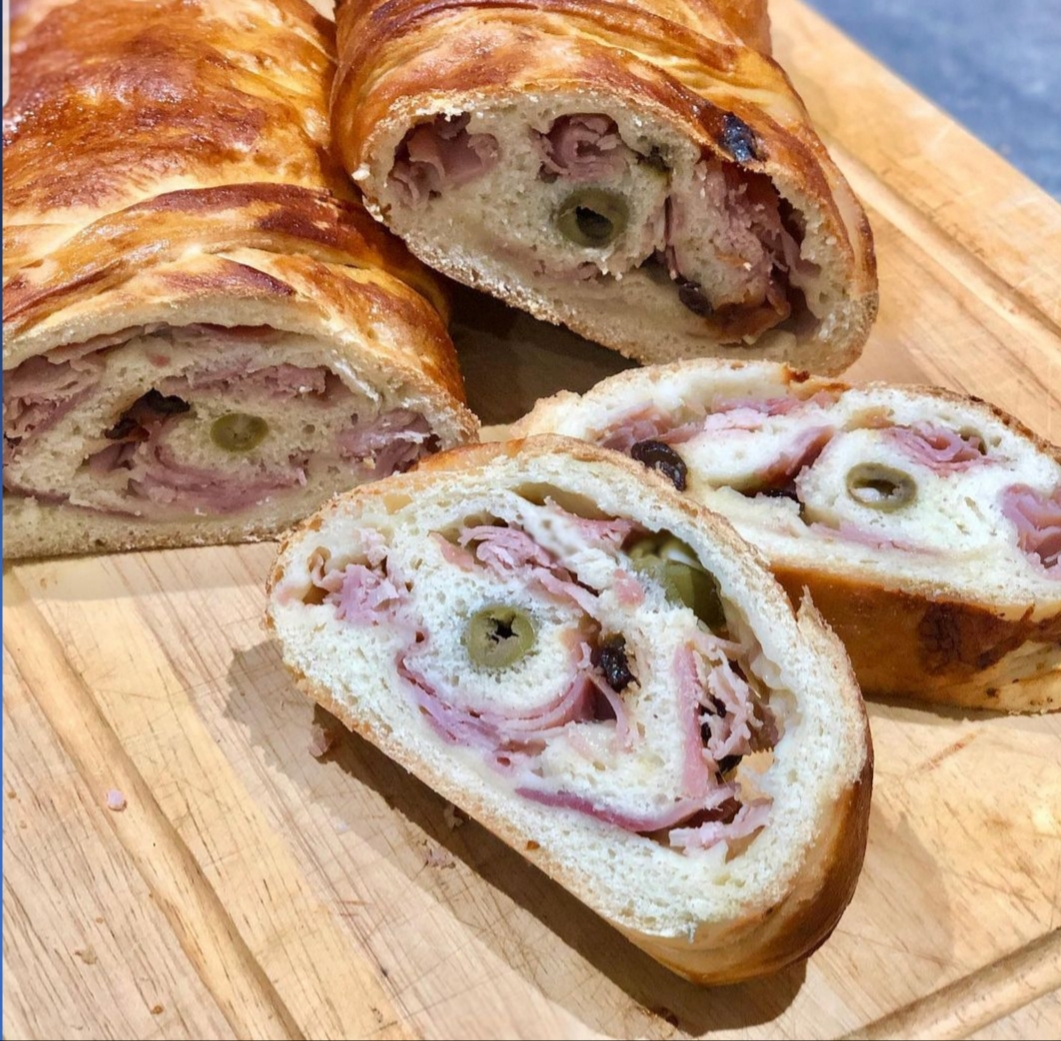 ¿Sabes que es el pan de jamón? SI no conoces el muy apetecible pan de jamón te lo cuento, es un pan con un toque algo dulzón relleno de jamón cocido , tocineta (bacon) , uvas pasas y aceitunas.