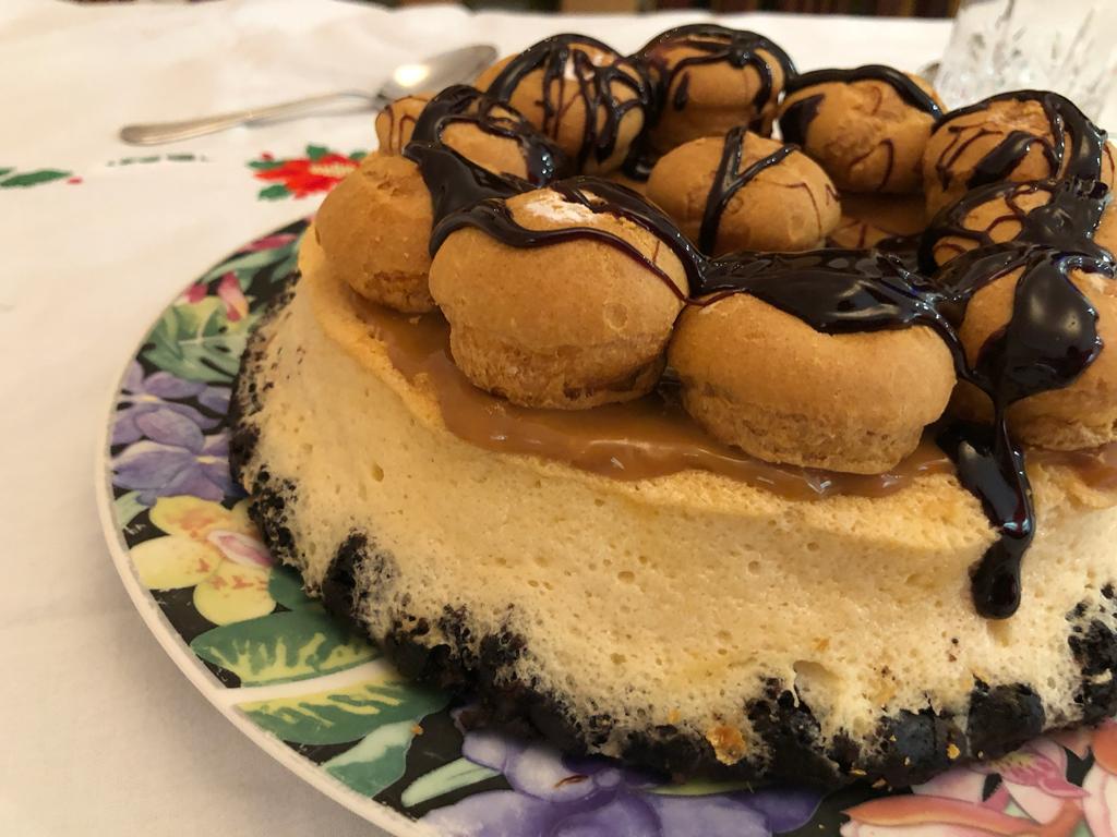 - Decora con los profiteroles encima de la tarta y báñala con el chocolate fundido a tu gusto. Para fijar los profiteroles utiliza crema de mantequilla o dulce de leche. ¡Ahora a disfrutar!