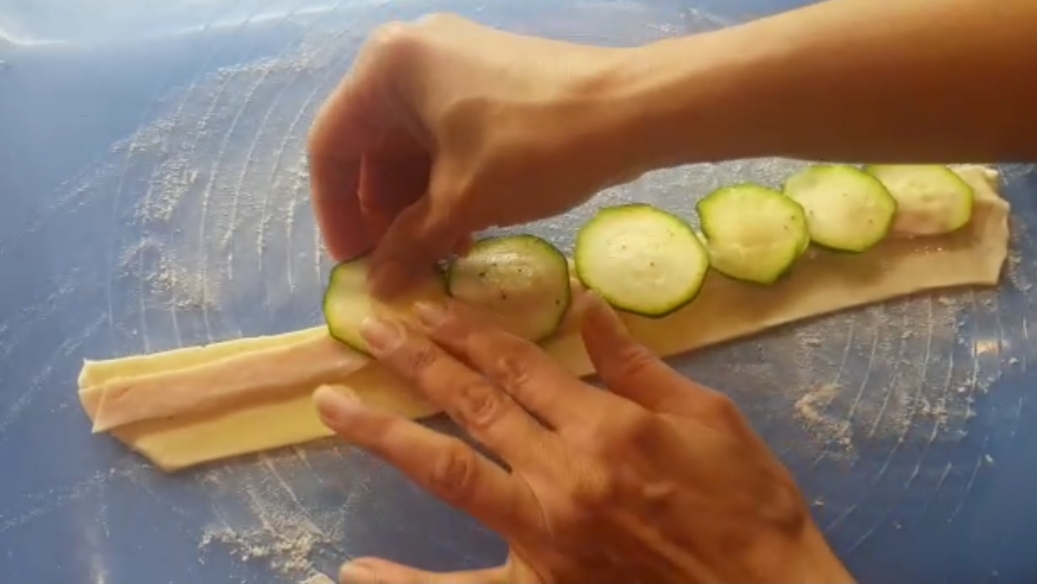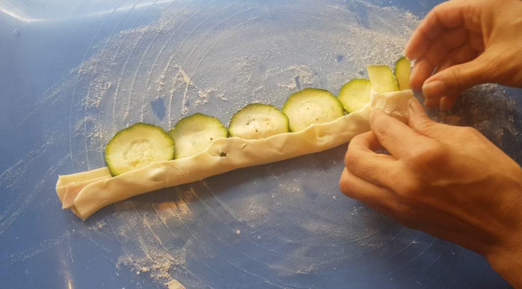 5.Coloque en el extremo de arriba de la masa el pavo, el queso ARLA y las láminas de calabacín en línea, luego doble hacia arriba el otro borde de la masa.