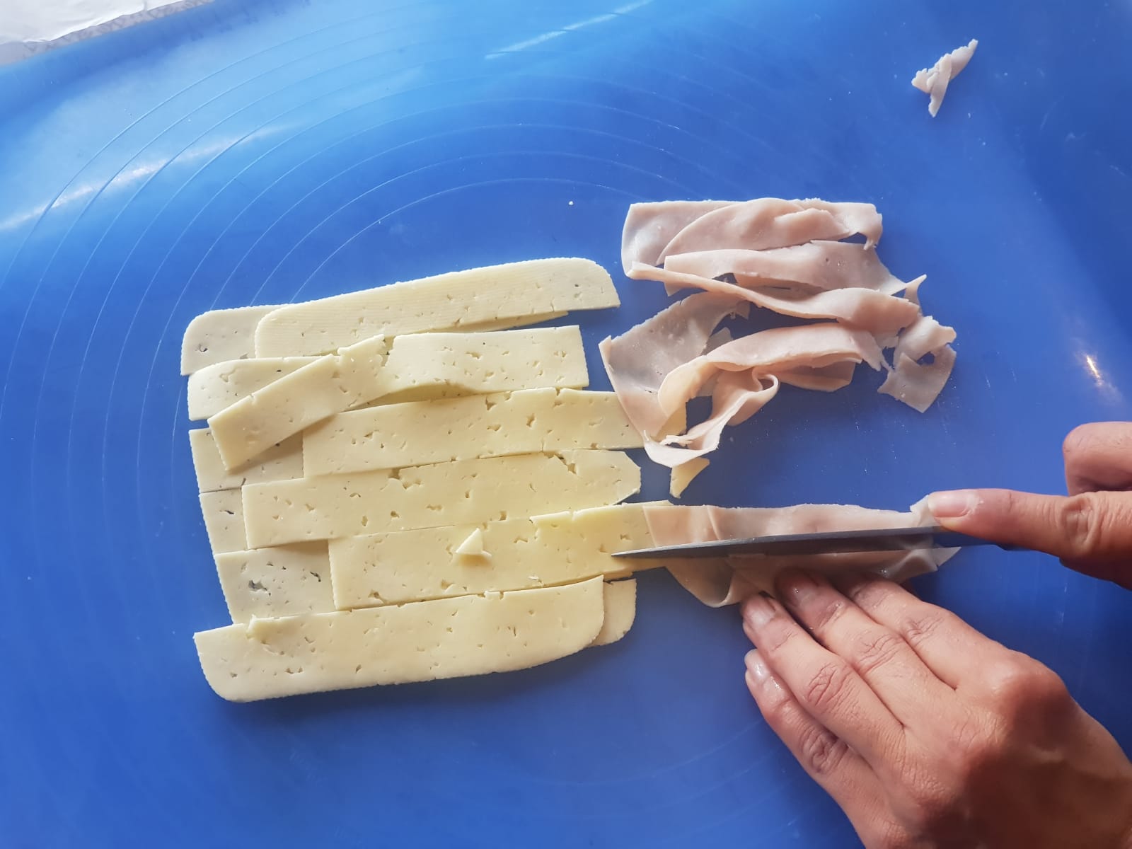 4.Corte las lonchas de pavo y queso ARLA en tiras de 2 cm.