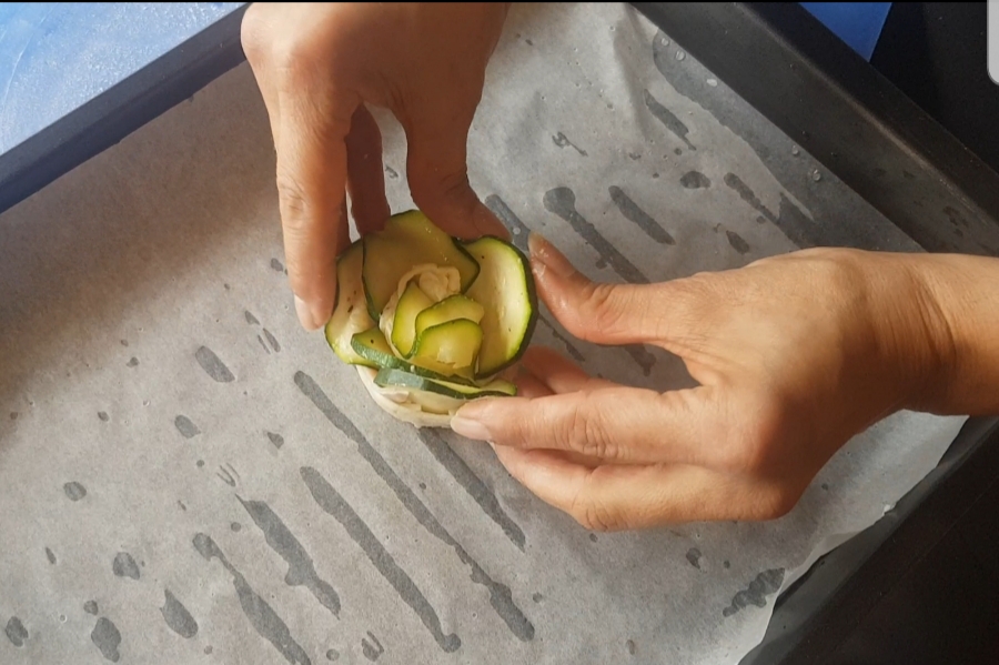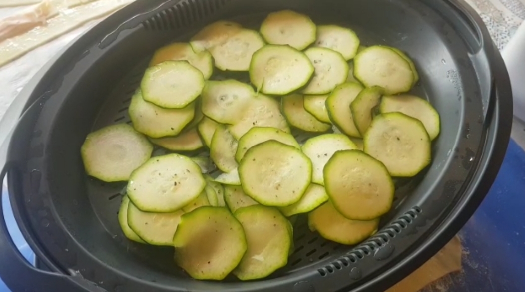 - Vierta el agua en el vaso. Sitúe el Varoma en su posición y ponga las láminas de calabacín espolvoreadas con sal y pimienta. Programe 6 min/Varoma/velocidad 2.